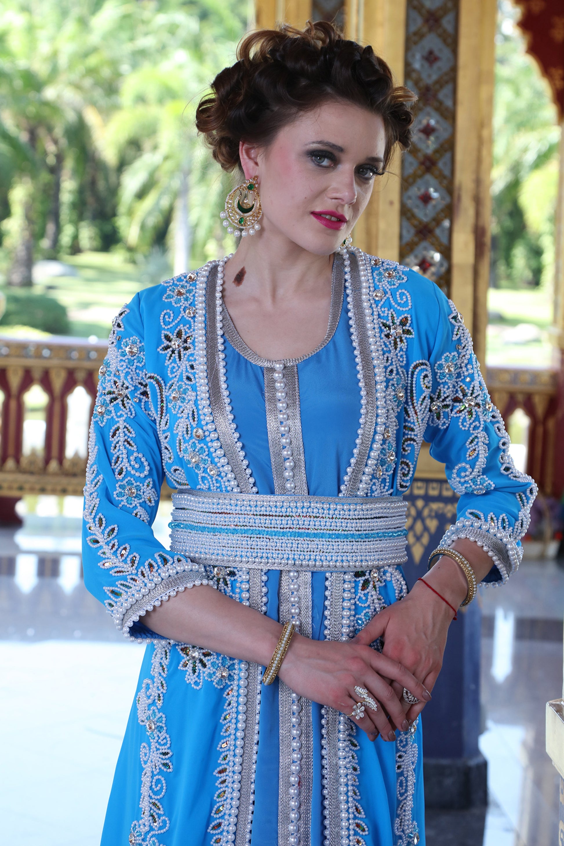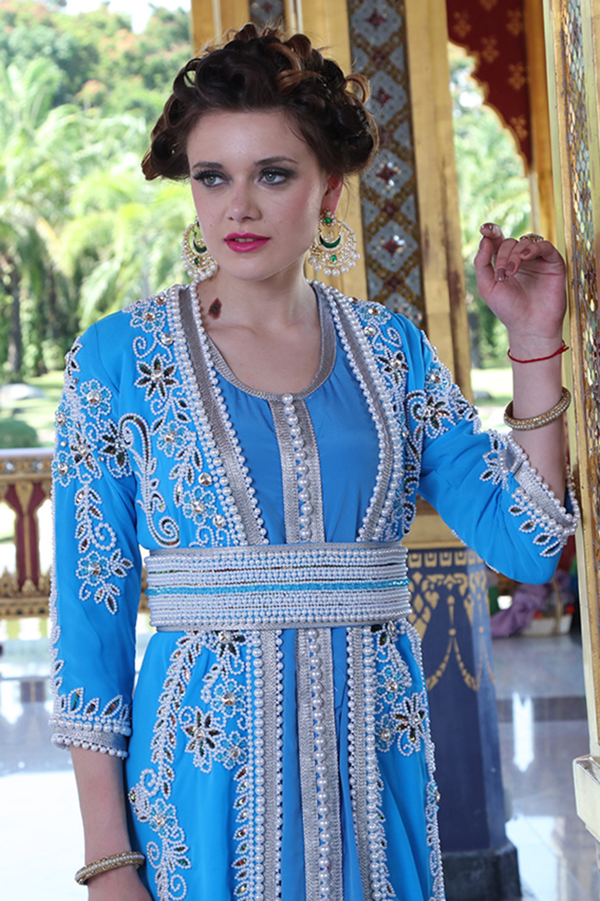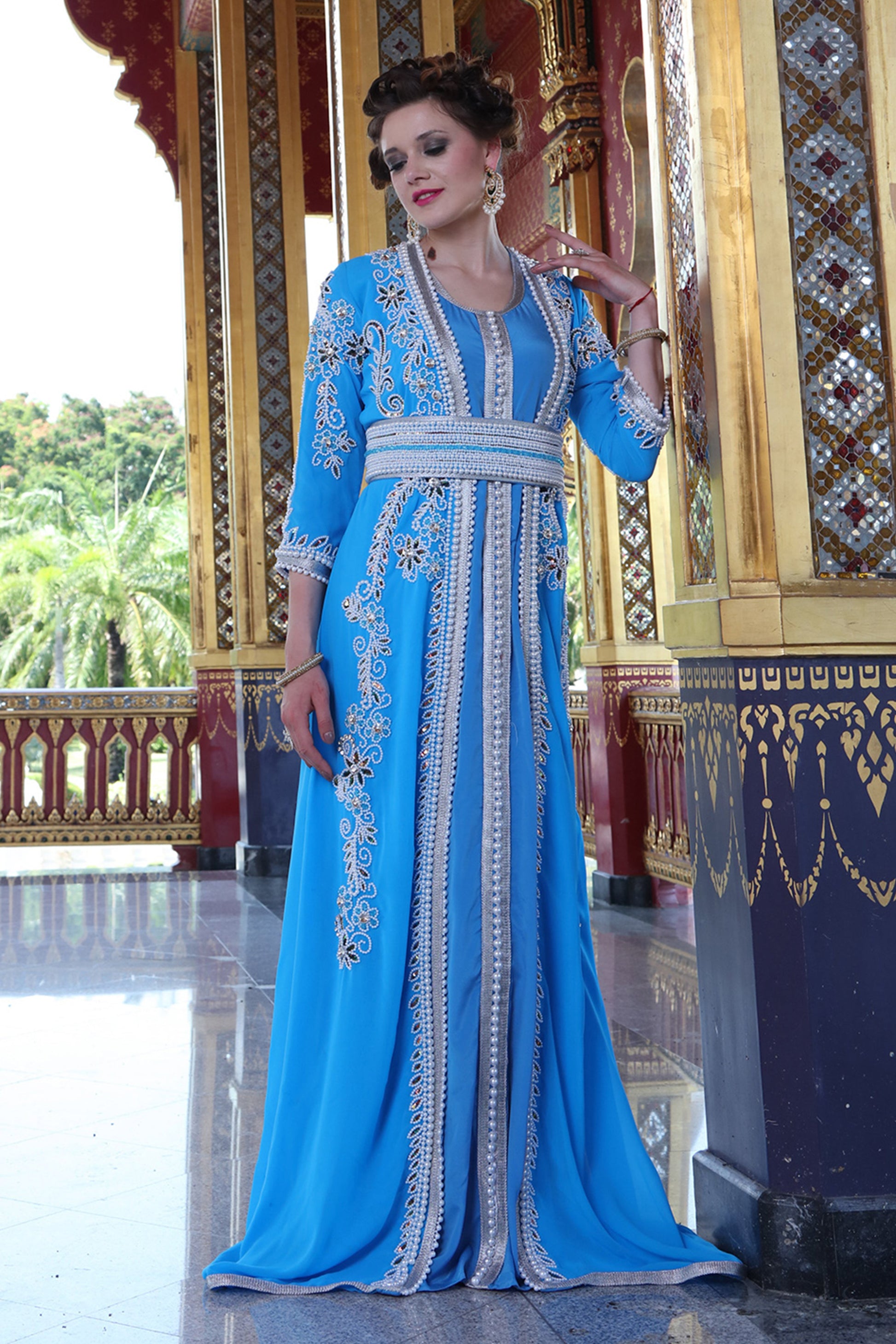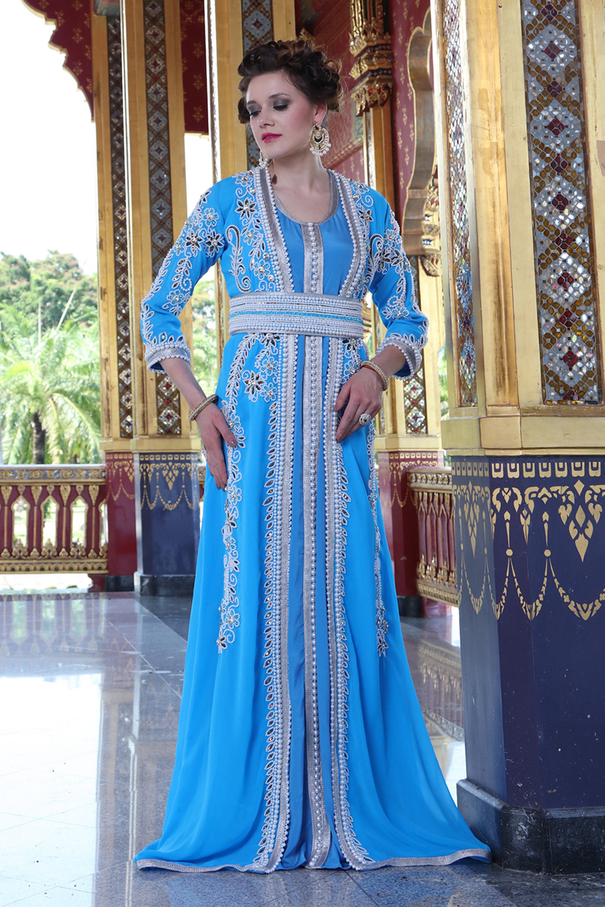 This Blue Firozi Color Moroccan Takchita Kaftan is a beautiful blend of tradition and style. The vibrant blue and firozi color combination makes it perfect for any special occasion like a wedding or party. The soft fabric is comfortable to wear, and the Moroccan design adds a unique touch to your look. Whether you're attending a celebration or just want to feel stylish, this kaftan will make you look and feel amazing. It's a must-have for your wardrobe.