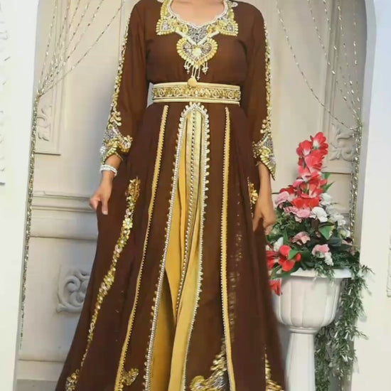Brown and Gold Dubai Moroccan Kaftan Arabic Maxi HandBeaded Farasha FloorLength Party Wear Wedding Kaftan / African Wedding Takchita Kaftan