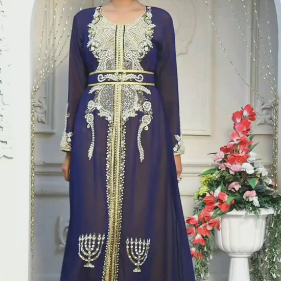Wedding Moroccan Caftan Dark Blue and Gold Designer Islamic Arabic Maxi HandBeaded Farasha Floor Length Israeli Kaftan