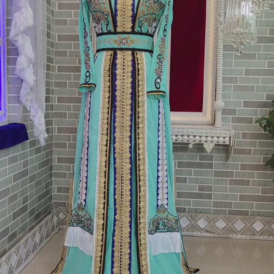 Mint Firozi Islamic Designer Embroidery Kaftan, Arabic Maxi Stylish Caftan, Israeli Party Wedding Dubai Kaftan Dress, Takchita Kaftan