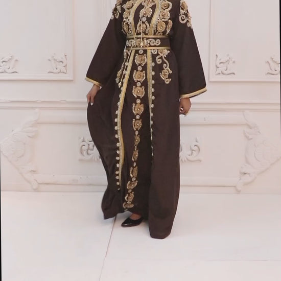 This Brown and Gold African Moroccan Style Wedding Takchita Kaftan for women is perfect for your special day! The rich brown and gold colors create a stunning contrast, while the traditional Moroccan design adds a unique touch. This handmade Arabic Maxi Kaftan gown is perfect for weddings or any formal occasion. The soft fabric makes it comfortable to wear, and the intricate details make it stand out. Whether you're the bride or a guest, this beautiful kaftan will have you feeling confident and stylish