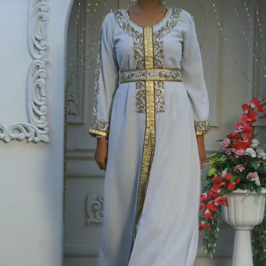 Light Grey Designer Islamic Wedding Moroccan Caftan Arabic Maxi Hand Beaded Farasha Floor Length Israeli Kaftan