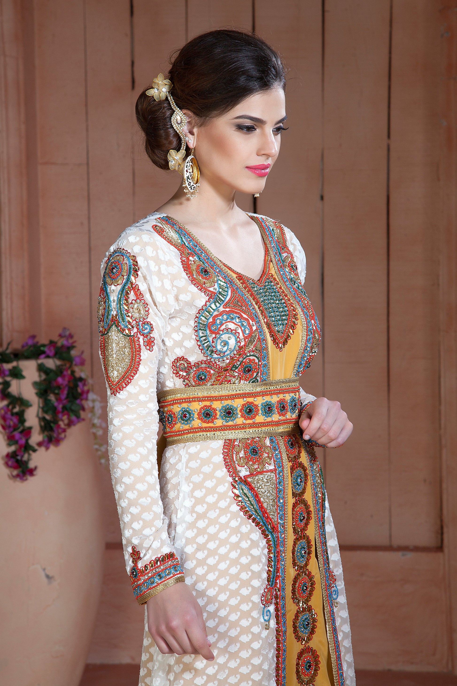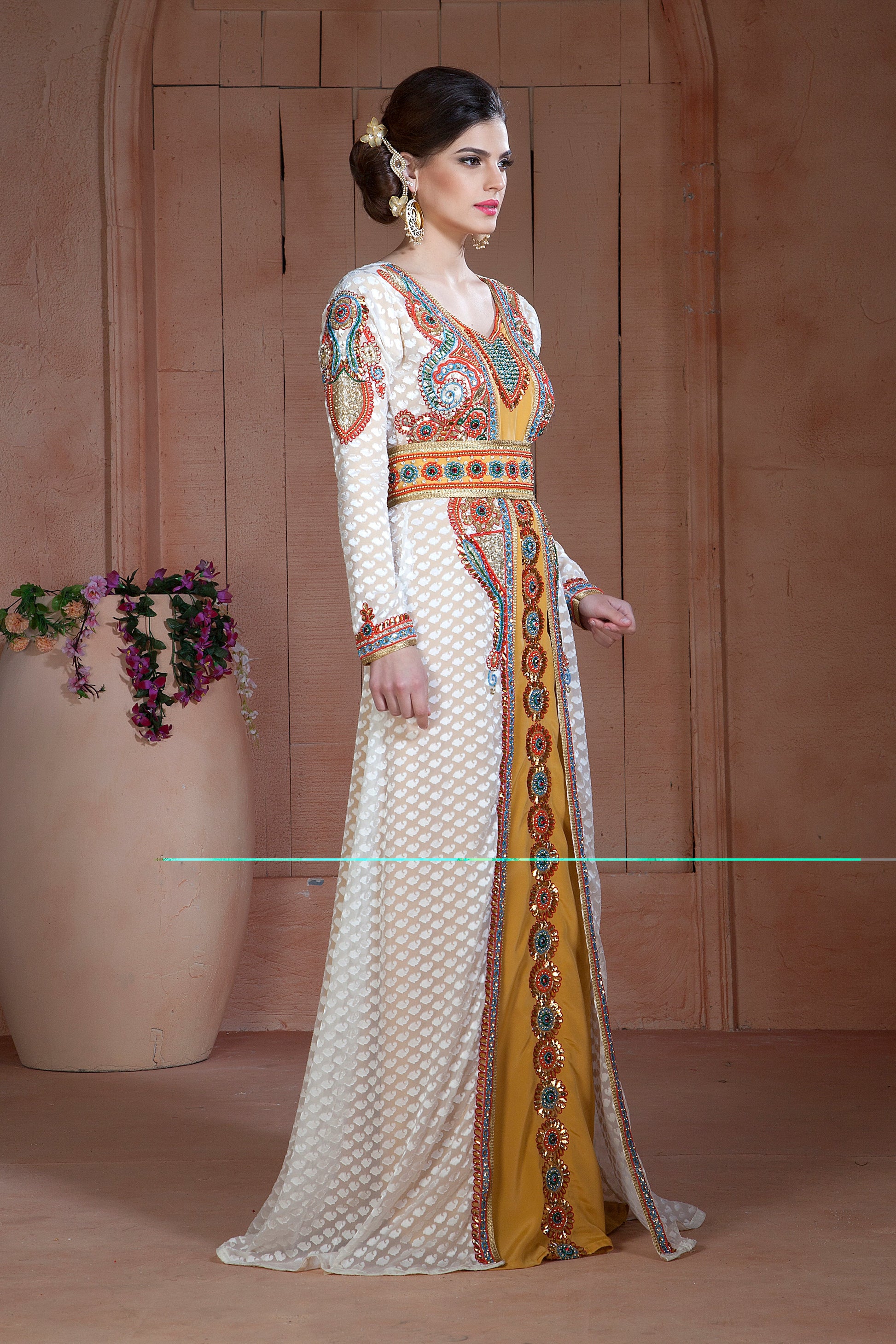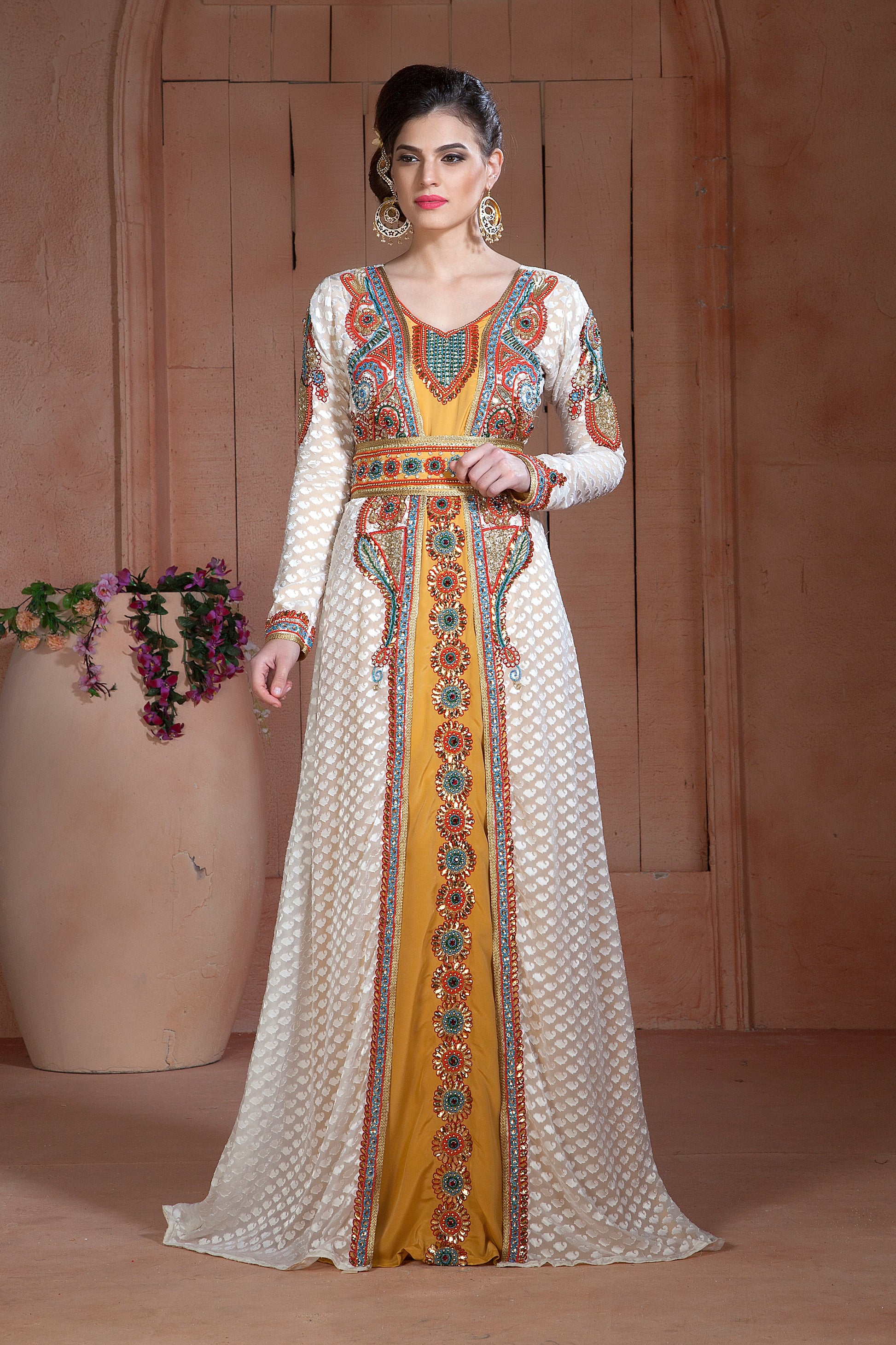 Off White and Golden Color Moroccan Hand beaded Caftan