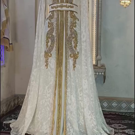 White and Gold Moroccan Hand Beaded Designer Kaftan