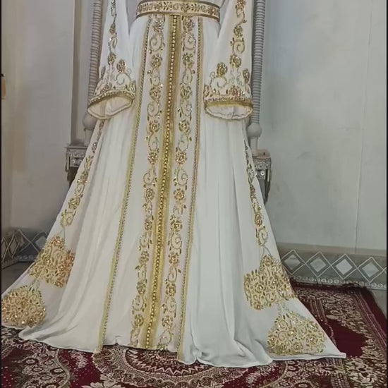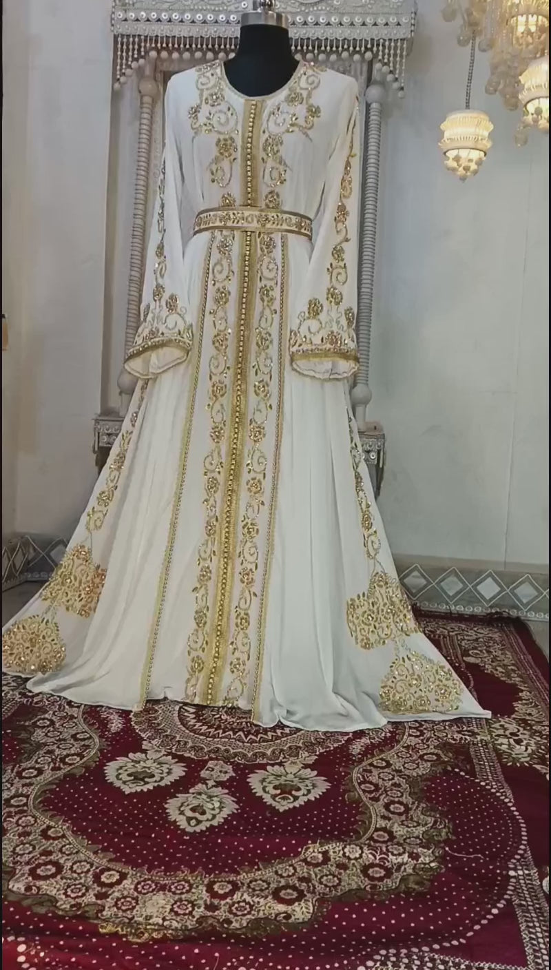 White Wedding Designer Arabic Maxi Hand Beaded Dubai Ladies Long Sleeve Moroccan Arabic Party Wear Kaftan With Embroidery Hijab