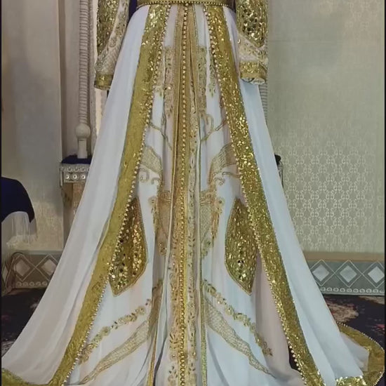 White Unique Designe Wedding Hand Beaded Moroccan Long Sleeve Kaftan Arabic Maxi Takchita Moroccan Kaftan, Islamic Wedding kaftan